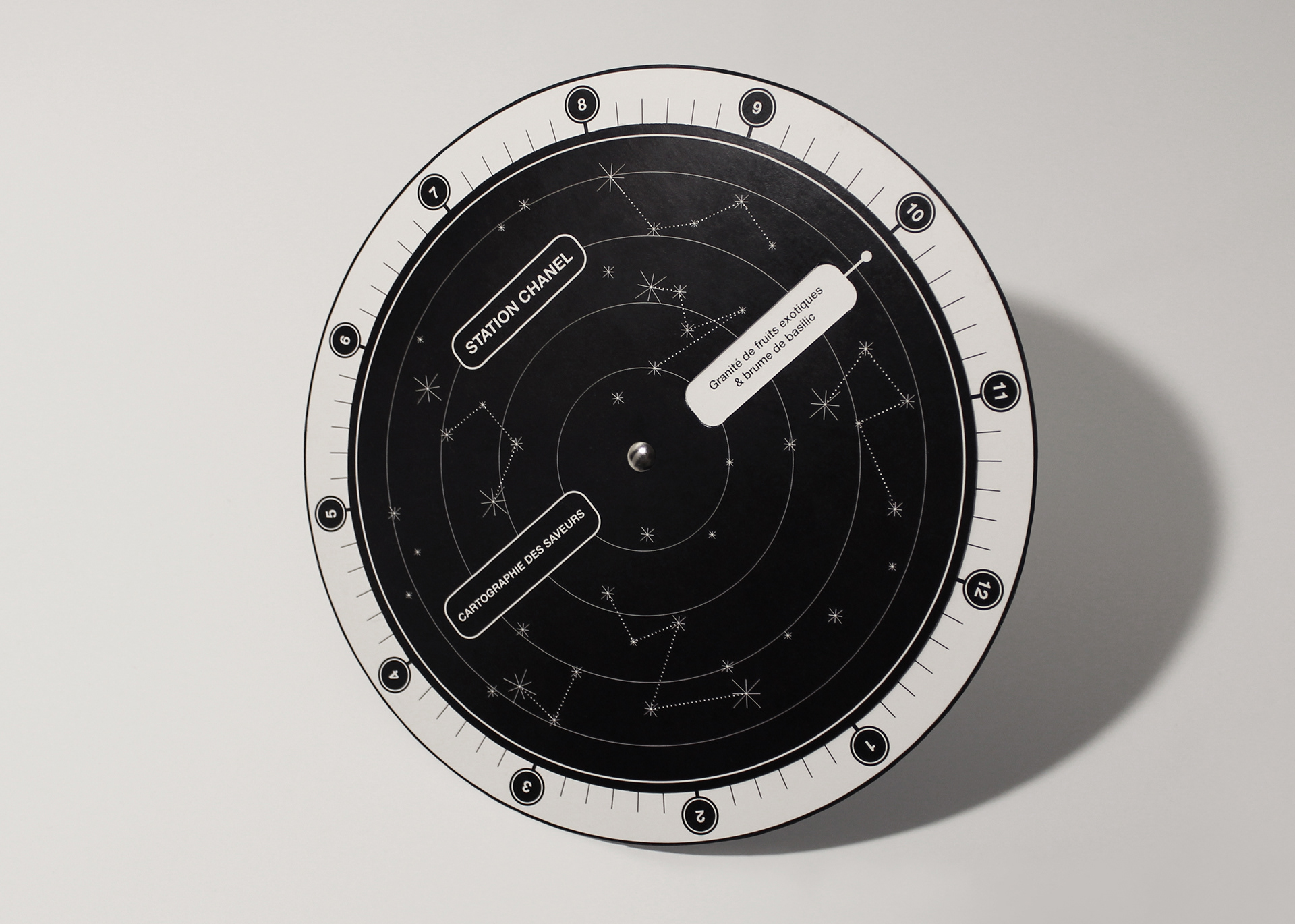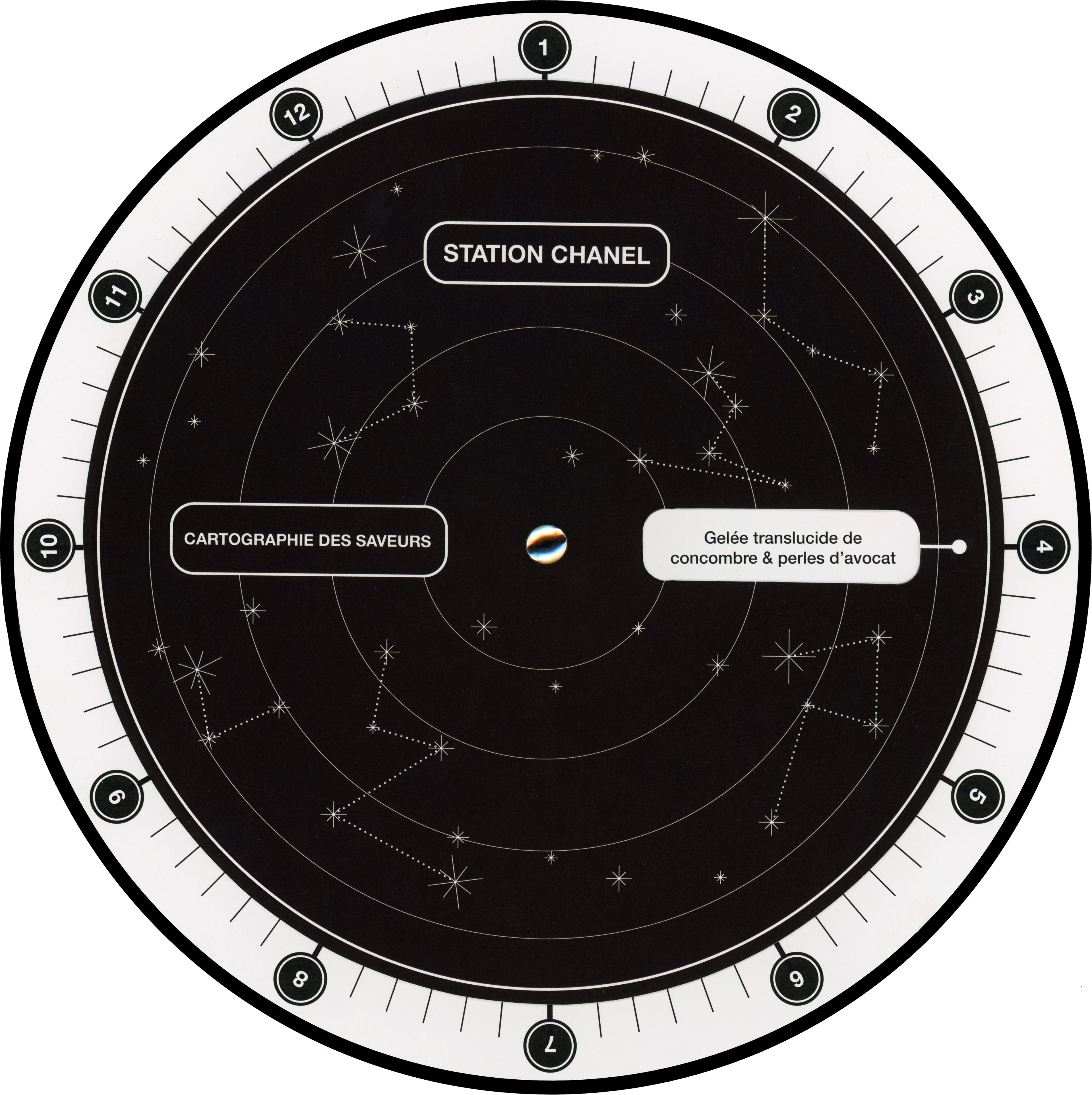 Molecular gastronomy menu presented on a rotating disc, designed as a fine dining experience for the special event : Station Chanel.